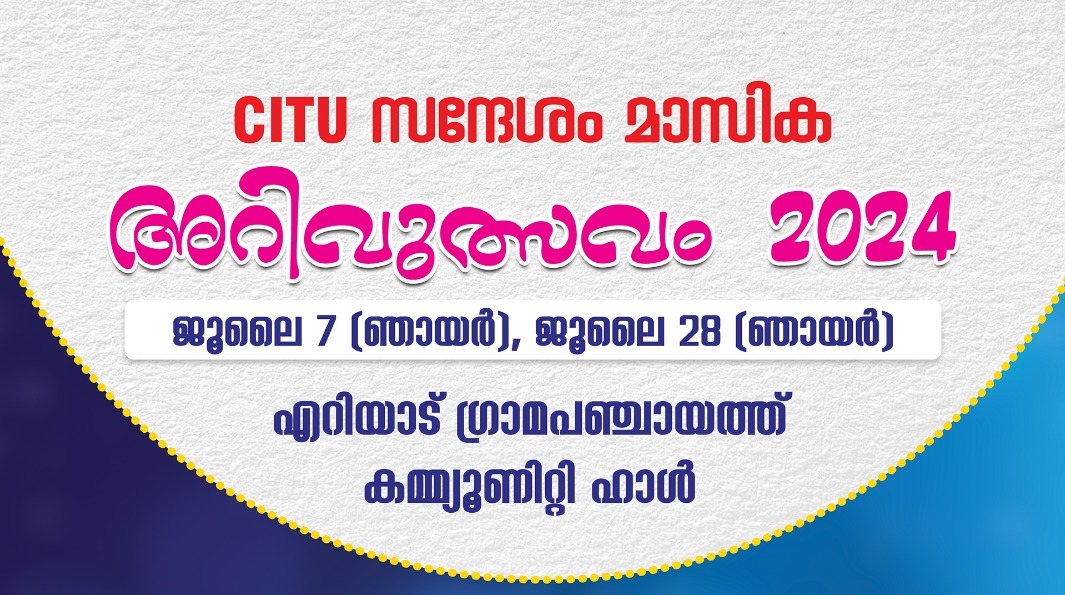 സിഐടിയു സന്ദേശം മാസിക അറിവുത്സവം – 2024 *ജൂലൈ 7 (ഞായർ)**ജൂലൈ 28 (ഞായർ)**എറിയാട് ഗ്രാമപഞ്ചായത്ത് കമ്മ്യൂണിറ്റി ഹാൾ* *തൊഴിലാളികളെ വരൂ……**നമുക്കൊരു സർഗോത്സവം തീർക്കാം……..* *മത്സര ഇനങ്ങൾ...