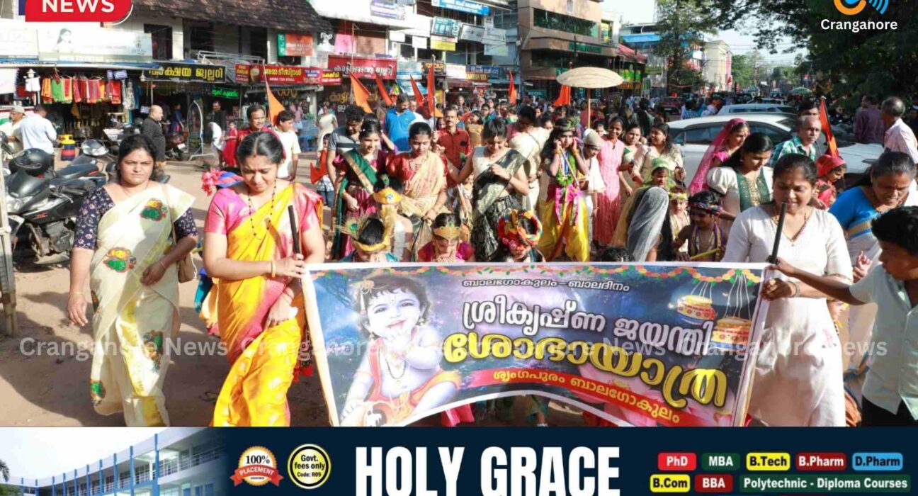 കൊടുങ്ങല്ലൂർ. നാടും നഗരവീഥികളും വൃന്ദാവനമാക്കി ഉണ്ണിക്കണ്ണൻമാരും ഗോപികമാരും നിറഞ്ഞാടി. ശ്രീകൃഷ്ണ ജയന്തിയോടനുബന്ധിച്ച് മേഖലയിൽ വലിയ ആലോഷങ്ങളാണ് നടന്നത്.പ്രാദേശികഘോഷയാത്രയായി കൊടുങ്ങല്ലൂർ ക്ഷേത്രത്തിന്റെ വടക്കെ നടയിൽ എത്തിയ ഘോഷയാത്ര ഒന്നിച്ച് മഹാശോഭയാത്രയായി മാറുകയായിരുന്നു. കണ്ണന്മാരായും രാധികമാരായും വേഷമിട്ടത് നൂറ് കണക്കിന് കുരുന്നുകൾ. വൈകിട്ടോടെ തെക്കെ നടയിൽ നിന്നാരംഭിച്ച മഹാശോഭയാത്ര നഗരം ചുറ്റി തെക്കെ നടയിൽ സമാപിച്ചു. ഘോഷയാത്രയുടെ വിവിധ ദൃശ്യങ്ങളിലേക്ക്