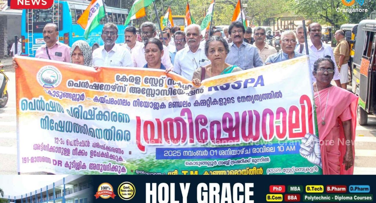 കേരളത്തിലെ സർവ്വീസ് പെൻഷൻകാർക്ക് അർഹമായ പെൻഷൻ പരിഷ്കരണവും ക്ഷാമാശ്വാസവും വർഷങ്ങൾ പിന്നിട്ടതിന് ശേഷവും നിഷേധിക്കുന്ന നിലപാടിനെതിരെ കേരള സ്റ്റേറ്റ് സർവ്വീസ് പെൻഷനേഴ്സ് അസ്സോസിയേഷൻ കൊടുങ്ങല്ലൂർ സബ് ട്രഷറിയുടെ മുന്നിൽ പ്രതിഷേധ പരിപാടി സംഘടിപ്പിച്ചു.