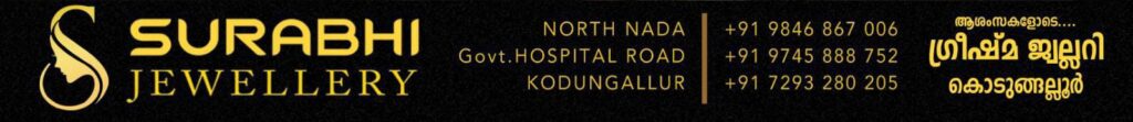 സ്വർണാഭരണ വിപണന രംഗത്ത് മൂന്നു പതിറ്റാണ്ടിൻ്റെ വിശ്വസ്ത പാരമ്പര്യവുമായി സുരഭി ജ്വല്ലറിയുടെ നവീകരിച്ച ഷോറൂം 2024 ആഗസ്റ്റ് 29 വ്യാഴാഴ്ച കൊടുങ്ങല്ലൂരിൽ പ്രവർത്തനം ആരംഭിച്ചിരിക്കുന്നു.