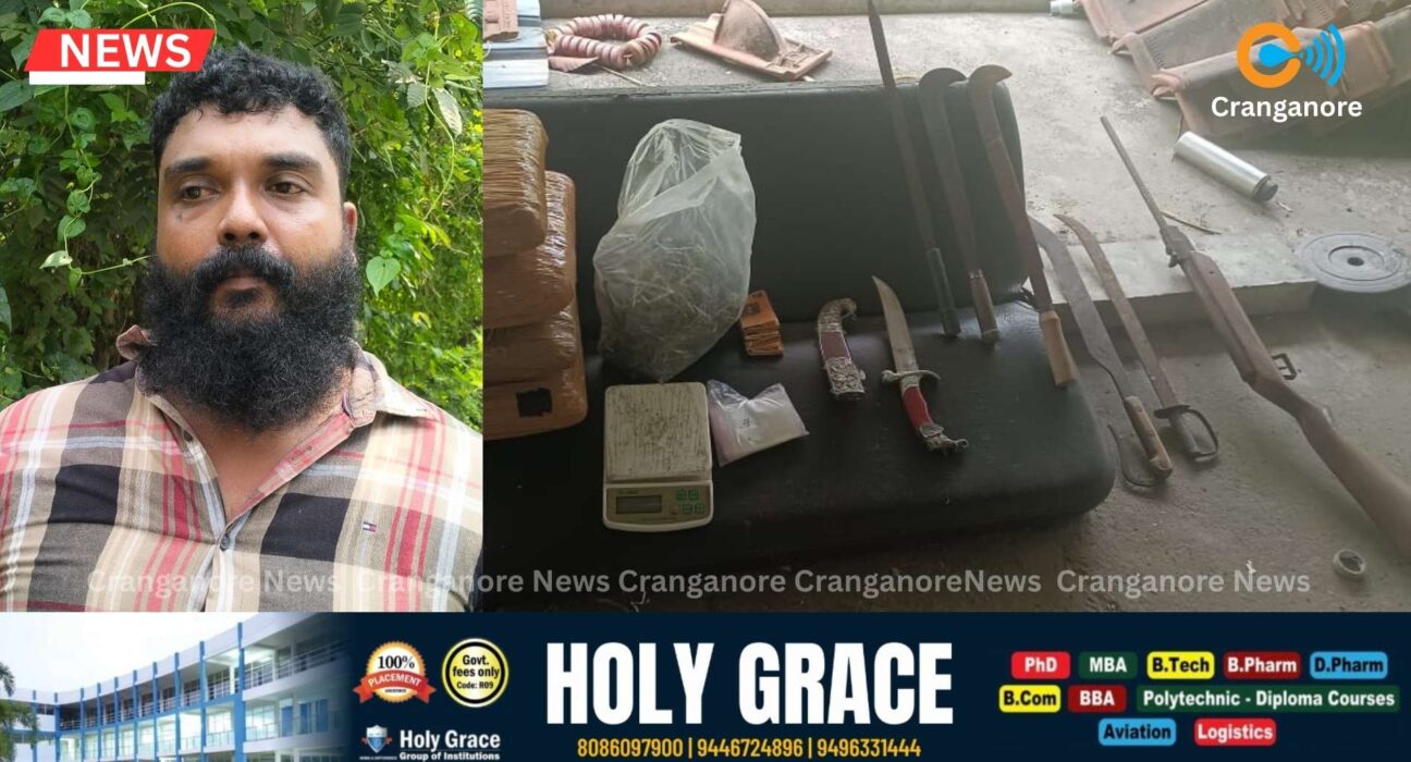 വലപ്പാട് : മീൻപിടിക്കാനെന്ന വ്യാജേന കഞ്ചാവ് വിൽപന നടത്തിവന്നിരുന്ന നാട്ടിക ബീച്ച് സ്വദേശി പുഞ്ചപ്പാടത്ത് വീട്ടിൽ വിഷ്ണു (37) എന്നയാളെ വൻ ലഹരിമരുന്ന് ശേഖരവും മാരാകായുധങ്ങളുമായി അറസ്റ്റ് ചെയ്തു. ഇന്ന് (09-03-2026) ഉച്ചയ്ക്ക് ശേഷം തൃശൂർ റൂറൽ ജില്ലാ പോലീസ് മേധാവിയുടെ നേതൃത്വത്തിലുള്ള ഡാൻസാഫ് (DANSAF) ടീമും വലപ്പാട് പോലീസും ചേർന്ന് നടത്തിയ മിന്നൽ പരിശോധനയിലാണ് വീടിന്റെ ടെറസിനു മുകളിൽ ഒളിപ്പിച്ച നിലയിൽ വിൽപ്പനക്കായി സൂക്ഷിച്ച മുന്തിയ ഇനം ഗ്രീൻസ് ഇനത്തിൽപ്പെട്ട 6 കിലോ 830 ഗ്രാം കഞ്ചാവും വ്യത്യസ്ത ആകൃതികളിലുള്ള അഞ്ച് വടിവാളുകൾ, പ്രത്യേക തരം കത്തി, എയർഗൺ, കഞ്ചാവ് തൂക്കം നോക്കുന്നതിനുള്ള ഡിജിറ്റൽ ത്രാസ്സ്, കഞ്ചാവ് പാക്ക് ചെയ്യാൻ ഉപയോഗിക്കുന്ന ചെറിയ പോളിത്തീൻ കവറുകൾ എന്നിവയാണ് ഇയാളുടെ പക്കൽ നിന്നും പിടിച്ചെടുത്തത്. അറസ്റ്റ് ചെയ്ത പ്രതിയെ നടപടിക്രമങ്ങൾക്ക് ശേഷം പ്രതിയെ കോടതിയിൽ ഹാജരാക്കും.
